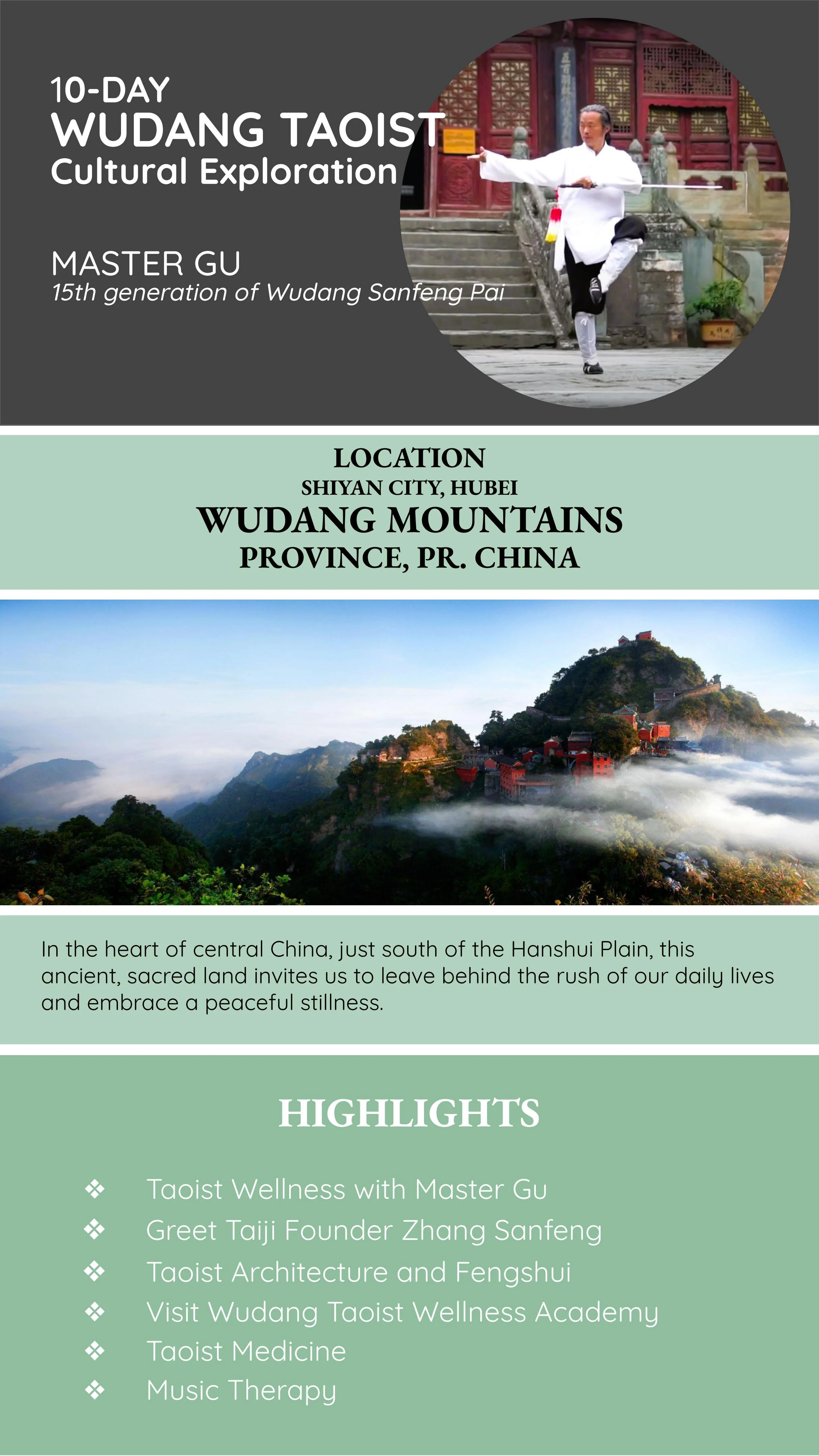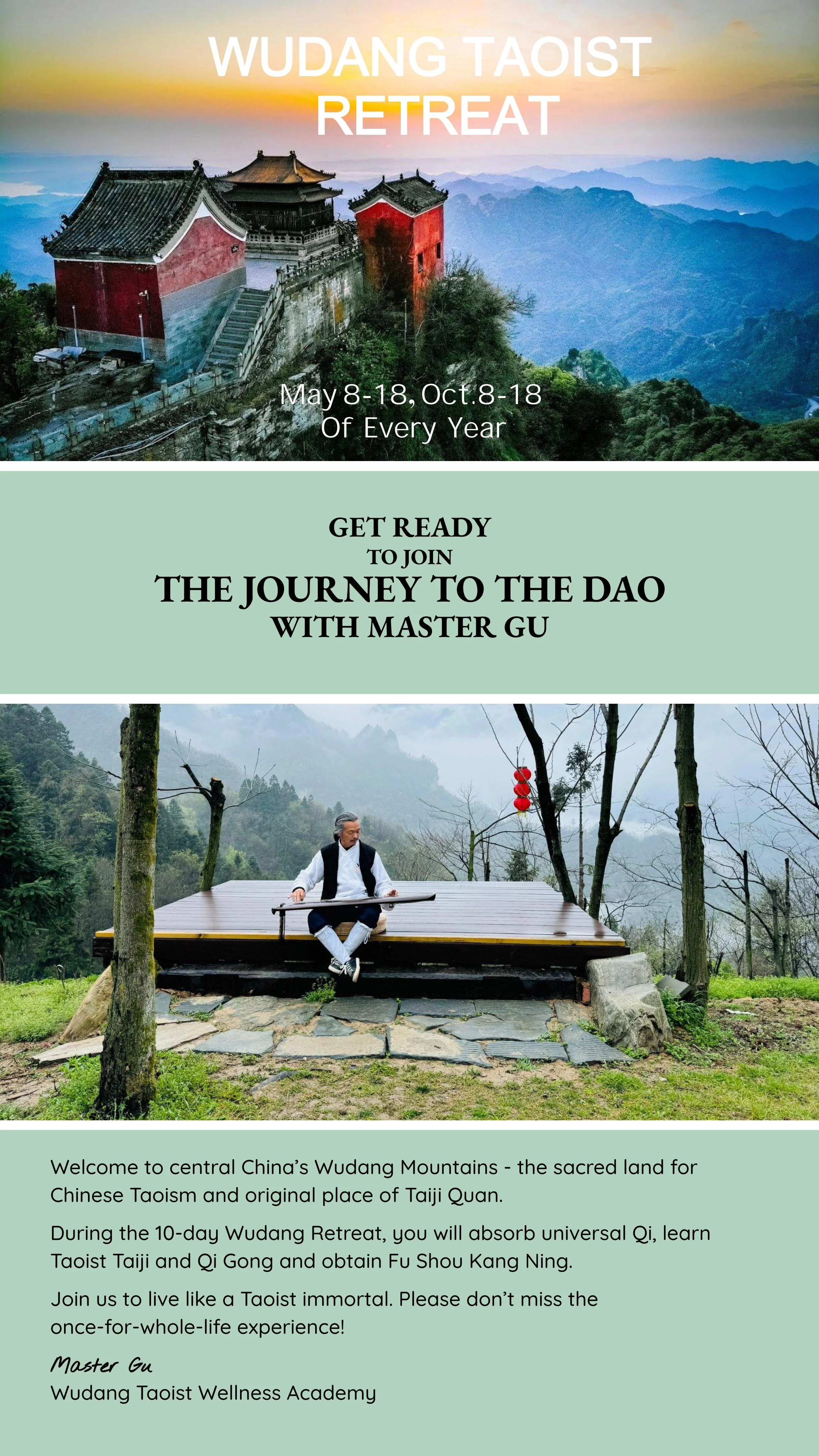 Experience the Taoist way of life alongside Master Gu and the Wudang Taoist Wellness Academy team.